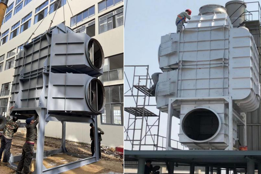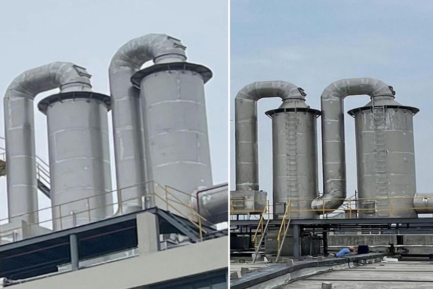 在磷化工、石墨、有色冶煉等行業(yè),生產(chǎn)排放的飽和濕煙氣與低溫環(huán)境空氣接觸時(shí),在煙氣溫度下降過(guò)程中,煙氣中的水蒸氣過(guò)飽和凝結(jié),凝結(jié)水滴折射和散射光線,使煙羽呈白色或灰色,稱為濕煙羽。由于冬季溫度較低,相關(guān)問(wèn)題的環(huán)保投訴較多。那么,有哪些種煙氣脫白技術(shù)?各種煙氣脫白的技術(shù)原理是怎樣的?1、冷凝相變煙氣脫白技術(shù)冷凝相變煙氣脫白原理為:煙氣經(jīng)濕法脫硫后,含濕量上升,為B狀態(tài),進(jìn)入換熱消霧模塊后。干態(tài)空氣A入換熱消霧模塊兩者交換后,A溫度上升,含濕量不變,相對(duì)濕度降低,處于C。B煙氣,溫度降低,相對(duì)濕度不變,含濕量降低,液滴析出,轉(zhuǎn)為D。D和受熱C流出換熱消零模塊,在氣室中混合,使D溫度下降,濕度降低:C溫度上升,相對(duì)濕度上升,兩種狀態(tài)的煙氣混合,最終達(dá)到F狀態(tài),AF連線始終處于不飽和狀態(tài),因此,不會(huì)出現(xiàn)可見白煙或霧氣團(tuán)。可以看出,冷凝混風(fēng)技術(shù)是煙氣脫白的較好技術(shù)路線,特別是在北方寒冷地區(qū),單純的煙氣再熱很難消除煙囪白煙。2、低電耗離子束煙氣脫白技術(shù)低電耗離子束煙氣脫白原理為:高速電子射流擊穿煙氣,產(chǎn)生正負(fù)離子體基團(tuán),煙氣中氣溶膠、飽和水滴、微小顆粒物在離子束的撞擊下,不斷發(fā)生凝聚效應(yīng),顆粒物和水滴快速凝聚成團(tuán),在重力作用下,落到離子束除變器底部流入脫硫塔或廢水收集池,達(dá)到降解顆粒物,氣溶膠和水零的目的。廢氣中的氨氧化物,由高速電子束提供能量,快速與氨氣發(fā)生還原反應(yīng),生成副產(chǎn)物水。低電耗離子束煙氣脫白優(yōu)點(diǎn):1.放電產(chǎn)生的離子體中,電子能量高,幾乎可以和所有的惡臭氣體分子作用。2.反應(yīng)快,不受氣速限制。采用防腐蝕材料。3.用電成本低,操作極為簡(jiǎn)單,無(wú)需派專職人員看守,基本不占用人工費(fèi)。4.設(shè)備啟動(dòng)、停止十分迅速,隨用隨開,不受氣溫的影響。